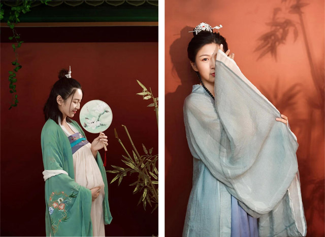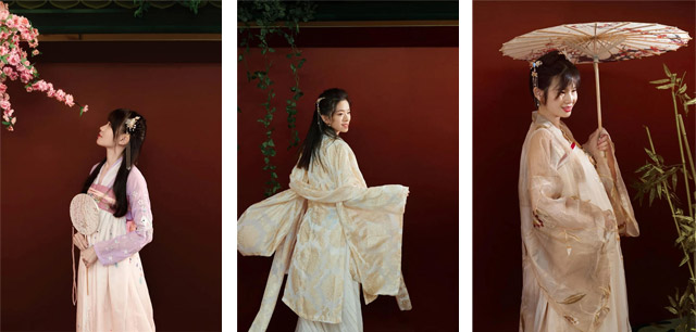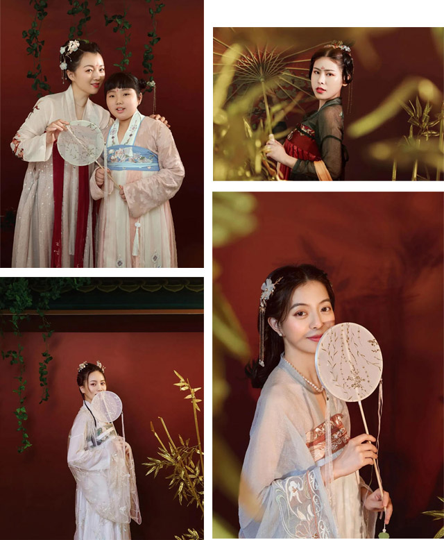 现场准备了多款汉服随心挑选,梳发髻,贴额花,多位专业化妆师妆发造型辅助。