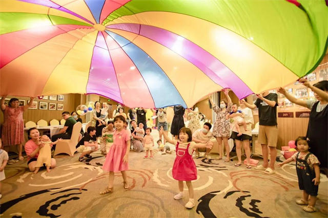 降落伞活动开始前,主持人号召爸爸妈妈小朋友们一起动手参与铺降落伞,大家非常积极而且团结协作,把降落伞升起落下。在爸爸妈妈的陪伴下,小朋友们随着音乐节奏摇起手摇铃、追赶七彩泡泡,脸上满是欢笑!