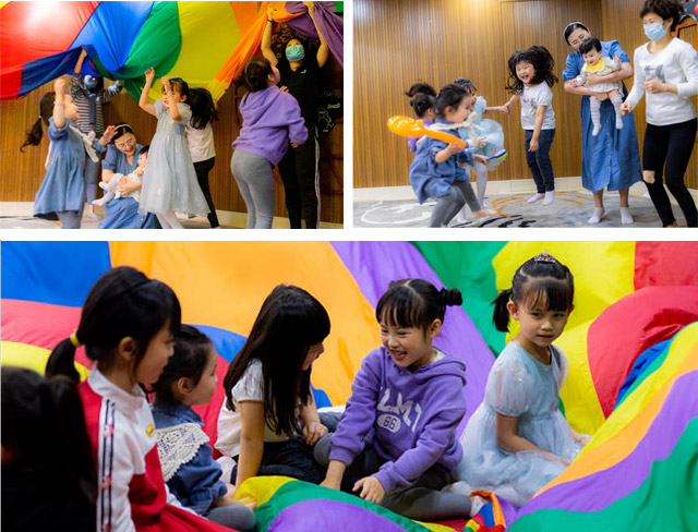 干货满满的妈咪课堂后,金宝贝早教中心的老师们给妈妈和宝贝们带来了亲子互动游戏——降落伞,唤醒了宝贝们的活力,让妈妈和宝宝的关系更亲密。