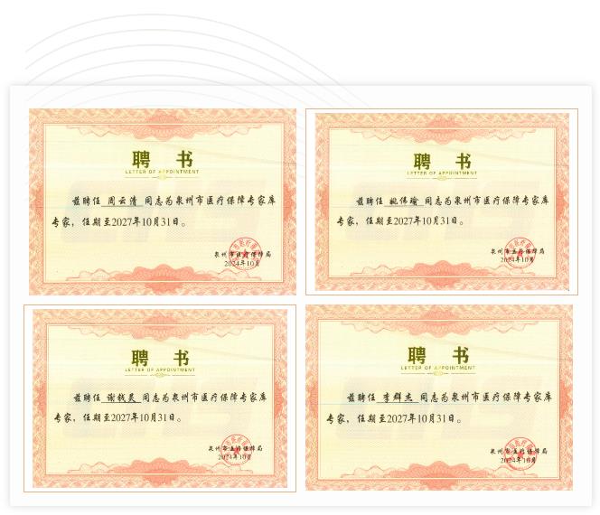 近日,玛珂迩妇产医院妇产科主任医师周云清教授、麻醉学主任医师姚伟瑜教授、麻醉学主任医师谢钱灵教授、麻醉学副主任医师李群杰教授受聘为泉州市医疗保障局专家库专家。四位专家的成功受聘,不仅是对专家个人专业能力、职业道德以及政治素质的高度认可,更是对我院整体医疗水平、服务质量及团队建设的充分肯定。