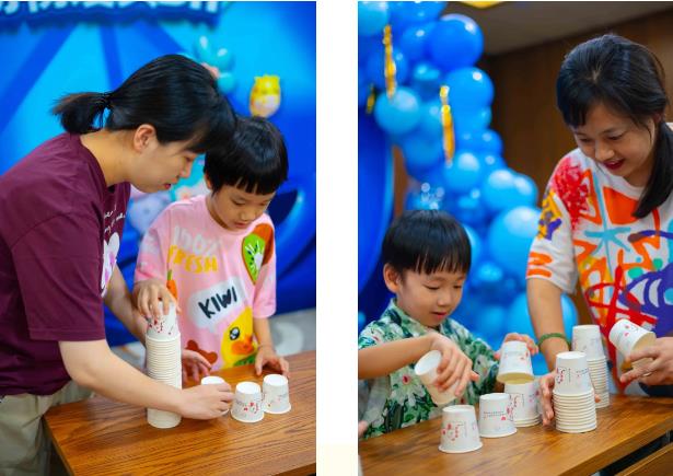 《抢杯子大战》限时比拼,为了将杯子叠得又快又高,宝贝们和家长们一起发挥聪明才智,配合默契,欢笑声欢呼声此起彼伏。