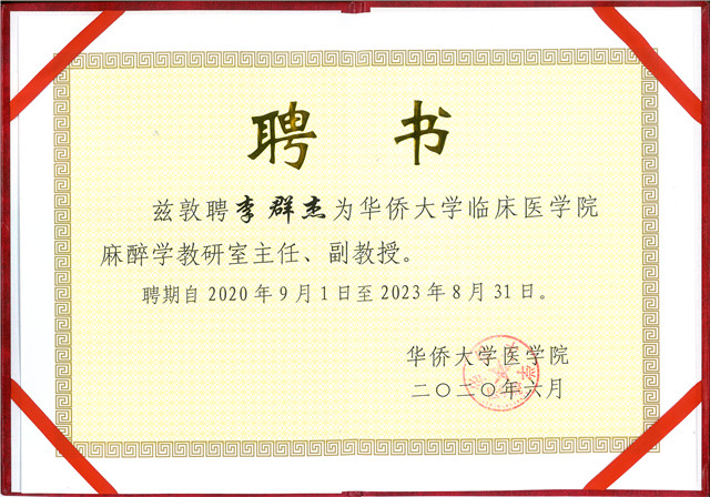 ▲华侨大学临床医学院麻醉学教研室主任、副教授聘书